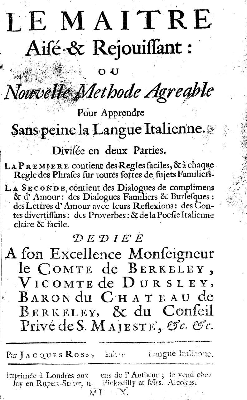 Dedie'e a son excellence monseigneur le Comte de Berkeley, Vicomte de Dursley, Baron du Chateau de Berkeley, & du Conseil Privé de S Majeste, &c. &c. Par Jacques Rossi, Maitre Langue Italienne. Imprimée â Londres aux depens de l'autheur; se vend chez luy et Mrs. Alcokes, M.DCC.X.