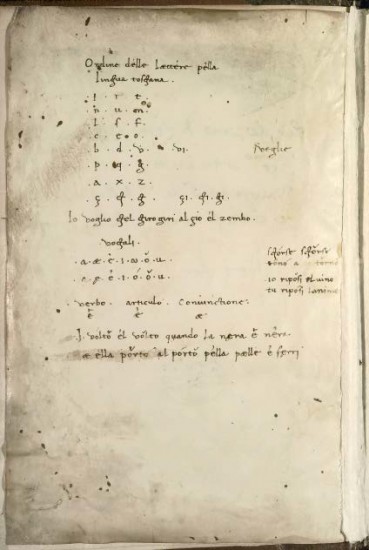 L'edizione della Grammatichetta che si sceglie di seguire è quella di Patota, Vallance (2003: 1-41), per la quale l'autore dichiara che «Je reproduis ici le texte de P [P = Patota, 1996: 15-39], dont les critères généraux ainsi que les amendements et les modifications par rapport aux éditions précédentes sont indiqués ci-après, avec quelques corrections et des ajustements mineurs»: (Ivi, p. LXXXVIII). Si ringrazia Giuseppe Patota per la gentile concessione della trascrizione del testo.